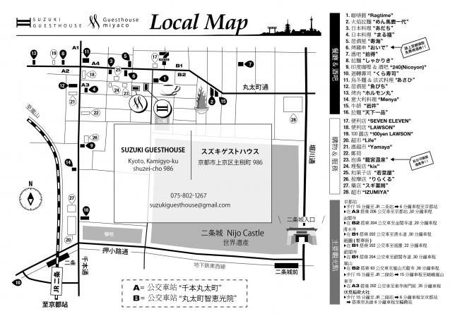 京都的主要交通工具是公交車,遍布整個城市。全城只有1條JR電車,2條地鐵,基本觀光不會用到。京都景點很分散,我們位於京都市中心地區住宅小街,二條城附近,銜接兩條主幹道,環境安靜,交通方便。您可利用周邊交通輕松前往祇園,清水寺,金閣寺,銀閣寺,嵐山,京都御所,下鴨神社,鴨川,伏見蹈荷大社,京都站等主要景點。