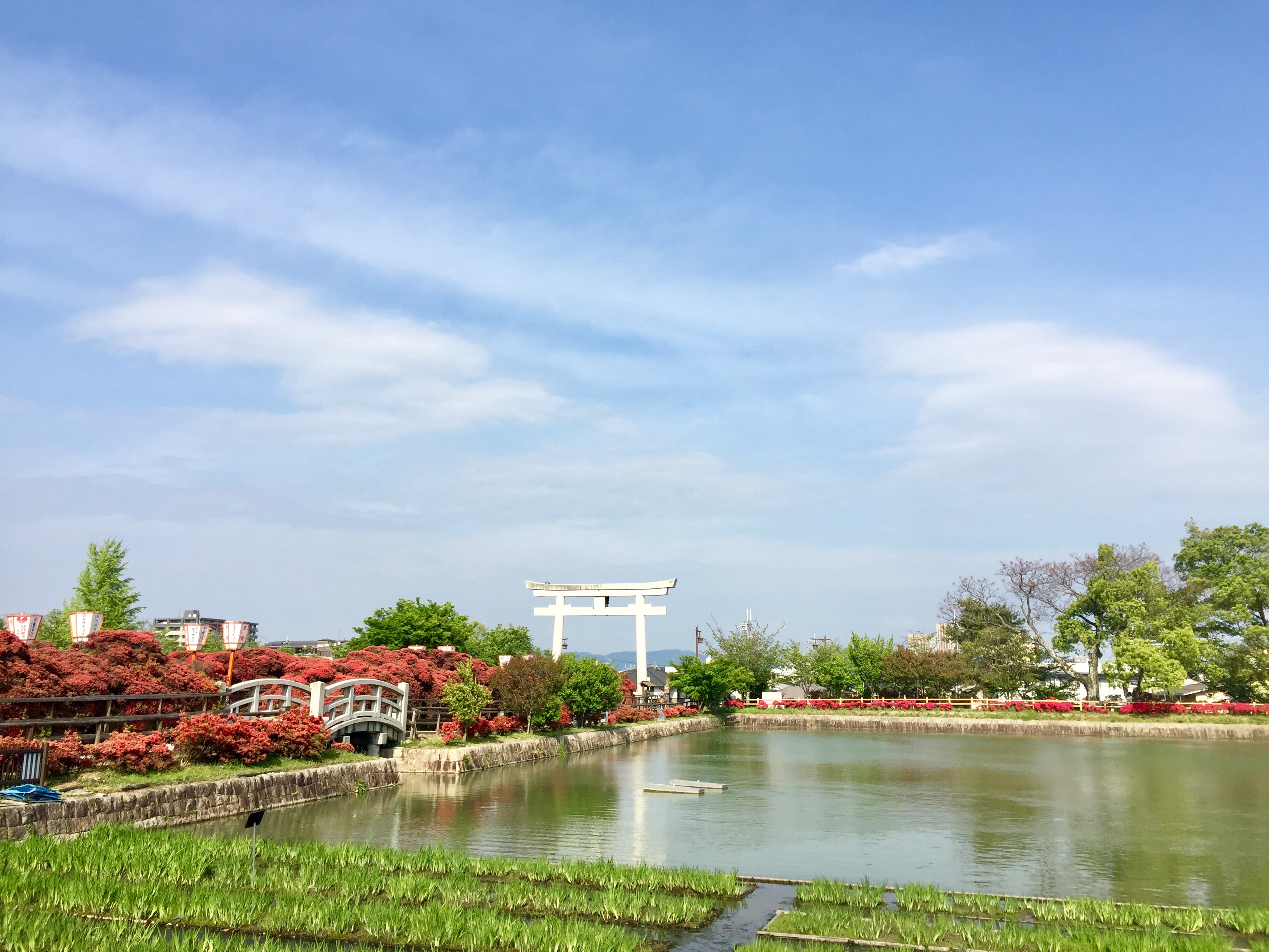 A shrine famed by it’s Kirishima azalea. The front approach to the shrine is a bridge in the middle of the pond, connecting with another winding bridge leading to the east pond. The pond was originally built for irrigation, it’s surrounding by the azalea bush.