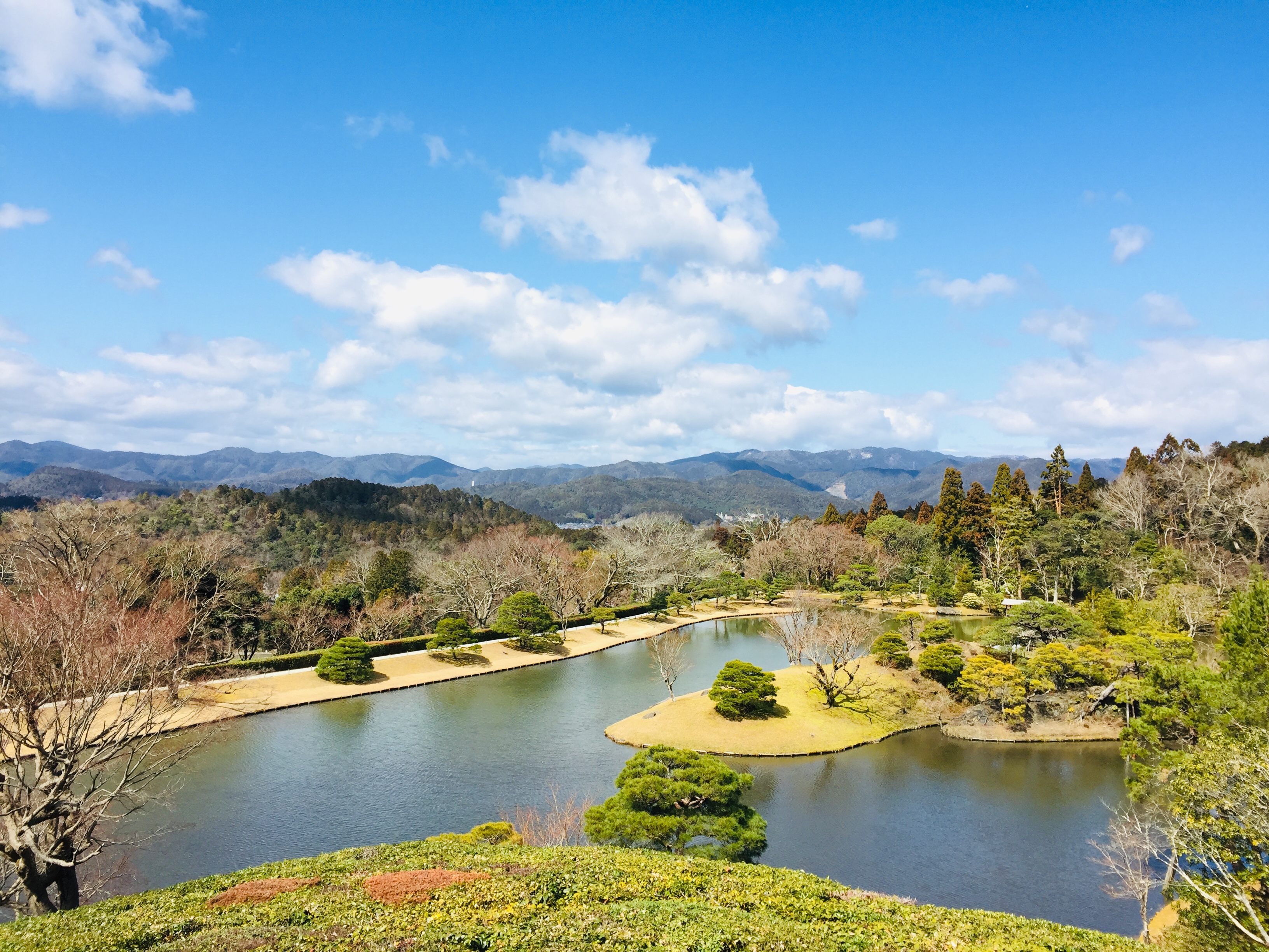 There are three villas. Climbing up to the top of the upper Villa, a panoramic view of Kyoto in the distance and a beautiful pond with an island in the middle will surprise you.